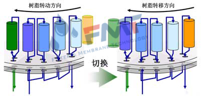 而物料通過(guò)一個(gè)自動(dòng)旋轉(zhuǎn)分配法控制,把樹(shù)脂柱分成交換、水洗、再生、漂洗等功能區(qū)域,當(dāng)樹(shù)脂單元到達(dá)指定區(qū)域就執(zhí)行相應(yīng)的工藝過(guò)程,這樣可以實(shí)現(xiàn)每個(gè)過(guò)程獨(dú)立進(jìn)行,而整體工藝成連續(xù)運(yùn)行。