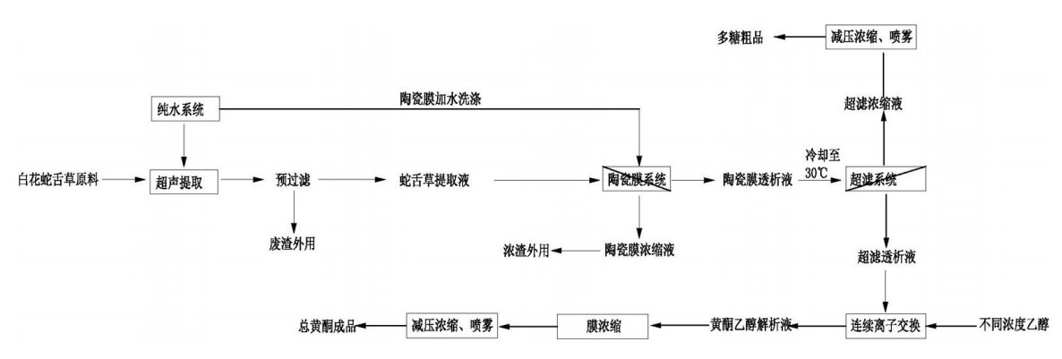 為達(dá)到上述目的,本發(fā)明提出的技術(shù)方案為:一種從白花蛇舌草中分離純化黃酮、 多糖的系統(tǒng),其特征在于:包括依次連接的超聲波提取裝置、預(yù)過濾裝置、陶瓷膜設(shè)備,所述的陶瓷膜設(shè)備的透析液出口連接超濾膜設(shè)備;所述的超濾膜設(shè)備的濃縮液出口連接第一減壓濃縮、噴霧裝置,透析液出口連接連續(xù)離子交換及色譜分離裝置,所述的連續(xù)離子交換及 色譜分離裝置的解析液出口依次連接膜濃縮設(shè)備、第二減壓濃縮、噴霧裝置。 所述的膜濃縮設(shè)備為納濾膜設(shè)備、反滲透膜設(shè)備或正滲透膜濃縮設(shè)備。