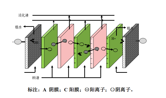 電滲析主要部件為陰、陽(yáng)離子交換膜,隔板與電極三部分。隔板構(gòu)成的隔室為液流經(jīng)過(guò)的通道。淡水經(jīng)過(guò)的隔室為脫鹽室,濃水經(jīng)過(guò)的隔室為濃縮室。若把陰、陽(yáng)離子交換膜與濃、淡水隔板交替排列,重復(fù)疊加,再加上一對(duì)端電極,就構(gòu)成了一臺(tái)實(shí)用電滲析。