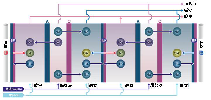 雙極膜電滲析設(shè)備是由雙極膜、陰膜和陽(yáng)膜組成的3室式電滲析設(shè)備,通過(guò)供給無(wú)機(jī)鹽(Na2SO4),陰離子(SO42-)透過(guò)陰離子交換膜和在雙極膜分解成的H離子(H+)結(jié)合成酸(H2SO4),另一方面,陽(yáng)離子(Na+)透過(guò)陽(yáng)離子交換膜和在雙極膜分解成的OH離子(OH-)結(jié)合成堿(NaOH)(進(jìn)行中和逆反應(yīng))。