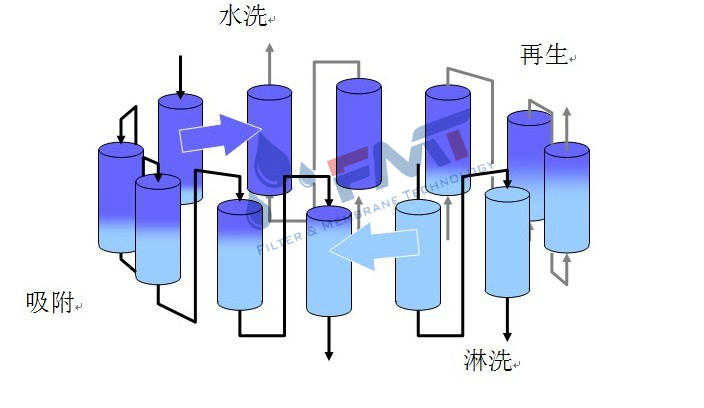 而物料通過(guò)一個(gè)自動(dòng)旋轉(zhuǎn)分配法控制,把樹(shù)脂柱分成交換、水洗、再生、漂洗等功能區(qū)域,當(dāng)樹(shù)脂單元到達(dá)指定區(qū)域就執(zhí)行相應(yīng)的工藝過(guò)程,這樣可以實(shí)現(xiàn)每個(gè)過(guò)程獨(dú)立進(jìn)行,而整體工藝成連續(xù)運(yùn)行。
