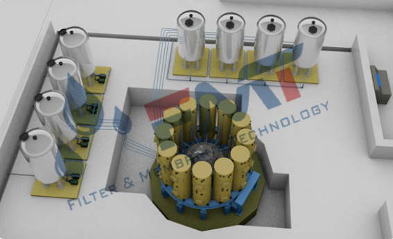 1、主機(jī):包括系統(tǒng)支撐、樹(shù)脂柱、閥芯。支撐固定部分作為整個(gè)連續(xù)離交系統(tǒng)的支撐結(jié)構(gòu),采用均勻分布的形式;閥芯主機(jī)作為連續(xù)離交的核心部分,采用福美科技自有知識(shí)產(chǎn)權(quán)多孔分配閥技術(shù),專(zhuān)利密封,用于連接外部物料進(jìn)出,實(shí)現(xiàn)功能分區(qū);樹(shù)脂柱作為交換容器用于填裝樹(shù)脂(或其他交換載體);