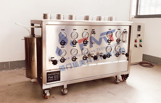 3. 膜池采用并聯(lián)設(shè)計(jì),采用快拆方式,很好地提高裝膜效率,可通過切換閥門,實(shí)現(xiàn)同時(shí)測(cè)試6個(gè)膜池,每個(gè)膜池對(duì)應(yīng)管路上均安裝有壓力傳感和流量,可實(shí)時(shí)監(jiān)測(cè)流量與系統(tǒng)壓力,透析液出口附于精密天平和電導(dǎo)率儀進(jìn)行數(shù)據(jù)采集,通過PLC可實(shí)時(shí)反饋系統(tǒng)參數(shù)如膜片截留率、通量等;
